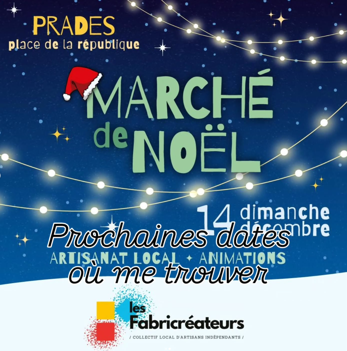 Marché de Noël - Prades - 14 décembre 2025 Les Fabricréateurs vous invitent à venir découvrir et redécouvrir leur travail à l'occasion d'un marché de Noël féérique dédié à l'artisanat et à la création, dimanche 14 décembre 2025, Place de la République à Prades. Au programme, une quarantaine d'artisans créateurs, dont de nouveaux exposants.
